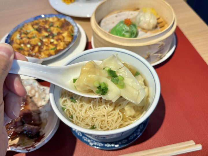 今回は「海老ワンタン麺」をチョイス。透明感のある澄んだスープに、細くしなやかな麺が泳ぎ、トッピングのワンタンはぷるぷる。中の海老はプリッとしており、口の中ではじけるような弾力が感じられます。スープは驚くほどあっさりで、飲み干したくなる上品な塩味。ワンタンの数もたっぷりで、ボリュームも満点です。