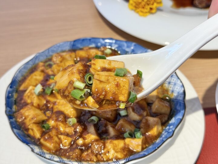 メインのおかずは、辛さ控えめの麻婆豆腐。豆鼓と花椒の香りを活かしつつ、子どもとシェアできるようにとピリッとしながらマイルドな仕上がり。とろみのある餡がごはんやチャーハンにぴったりで、思わず単品でご飯がほしくなる味です。