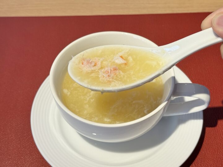 続いて登場したのは、ふんわりと卵が漂う蟹入りスープ。蟹の旨味とコーンの甘みが溶け込んだスープは、シンプルながら丁寧な味わいで、コースの幕開けにぴったりの一品。