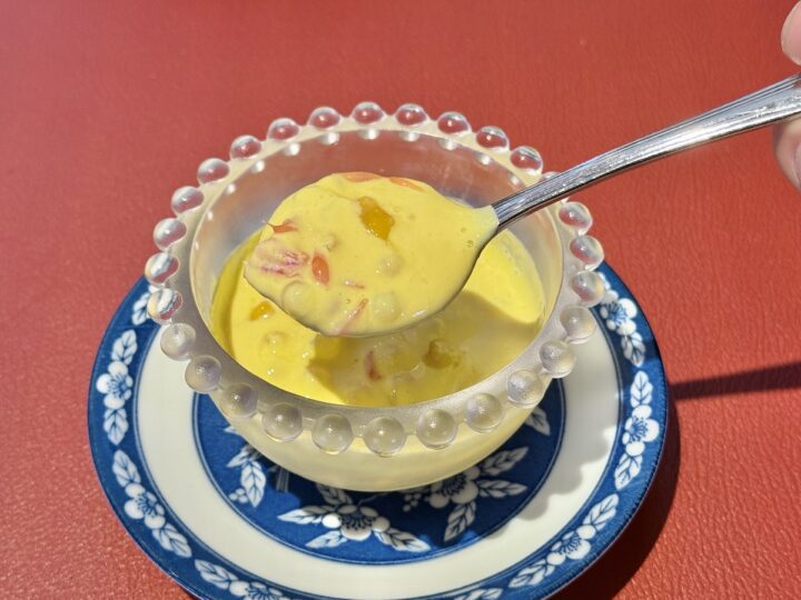 締めくくりは楊枝甘露(ヨンジーガムロウ)。濃厚なマンゴーの甘み小さなタピオカのプチプチ食感が絶妙なアクセント。最後まで飽きずに楽しめる香港スイーツの定番です。