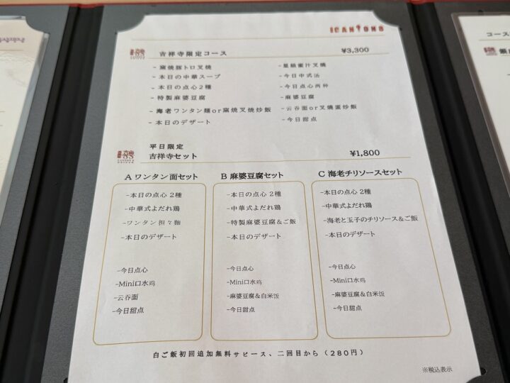 「A ワンタン麺セット」、「B 麻婆豆腐セット」、「C 海老チリソースセット」がそれぞれ1800円とリーズナブル。それぞれ本日の点心2種、中華式よだれ鶏、本日のデザート付き。 その他、「銀座コース」(5800円)もあり。今回は吉祥寺限定コースをいただくことにしました。