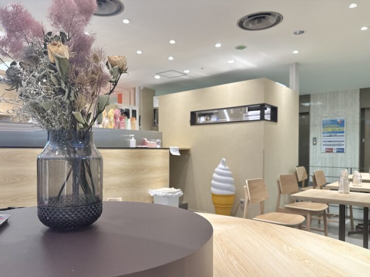 ドライフラワーが飾られたテーブルや、ナチュラルウッドのインテリアがやさしく迎えてくれる店内。ちょっとした休憩や子連れでの買い物ついで、ひとり時間にもぴったりな雰囲気。