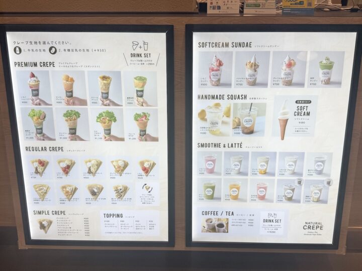 メニューはクレープだけではなく、ソフトクリーム、ソフトクリームサンデー、スムージーやアイスコーヒーや自家製スカッシュなど、ナチュクレのコンセプトに合った自然派志向のラインナップ。