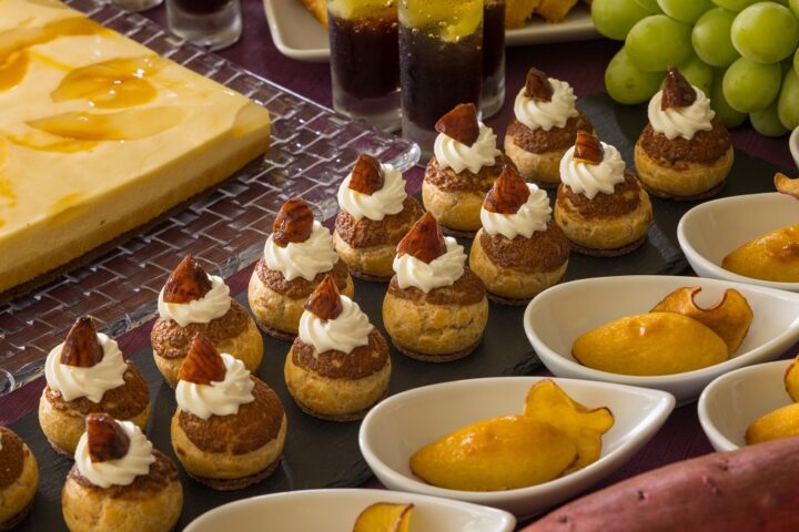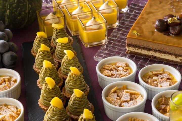 濃厚なチョコレートと栗のハーモニーが楽しめる“栗とチョコレートのムース”、香り高い洋梨にキャラメルのほろ苦さを合わせた“洋梨とキャラメルのムース”、栗本来の甘みを堪能できる“モンブランタルト”、巨峰とマスカットジュレがきらめく“葡萄のゼリー”、かぼちゃの甘みを活かした“南瓜のプリン”など、秋を代表する素材の魅力を贅沢に味わえます。