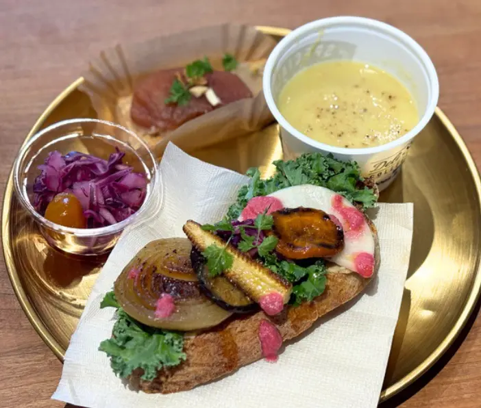 自家製酵母で長時間発酵させたサワードゥブレッドにひよこ豆のフムス、ハーブやスパイスで野菜をローストした「季節野菜のオープンサンド」、マリネやピクルスなどのデリ1品、薬膳ポタージュ、リンゴのスパイスコンポート等4品をワンプレート(1700円)で提供。