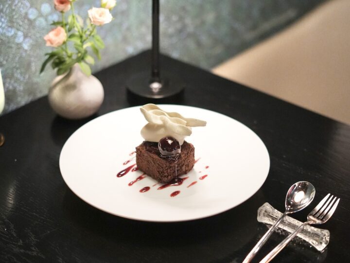 チョコレート×チェリーの濃厚デザート:高カカオチョコとアメリカンチェリー、フランス産さくらんぼ「グリオット」を組み合わせ、ローリエ香るメレンゲとアイスで完成。