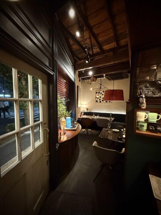 窓際には植物や本が飾られ、小さなギャラリーのような趣き。奥へと進むとテーブル席が並び、落ち着いた照明の中でゆったりと食事を楽しめる雰囲気が広がっています。