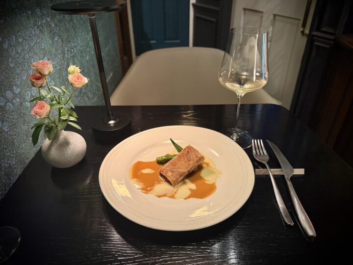 その日仕入れた白身魚(今回はヒラメ)を低温調理で仕上げ、薄い生地で巻き上げて香ばしく焼き上げています。オマール海老のアメリケーヌソースと季節野菜が添えられた逸品。