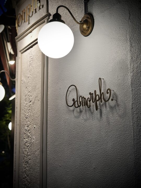外壁に取り付けられた真っ白な球体ランプが、ミュージシャン浅井健一氏によるデザインの流れるような筆記体「amorph.」の文字に影を落とし、まるでヨーロッパの街角に迷い込んだかのような錯覚を覚えます。店内にあったこの看板を今回、外壁に取り付けました。