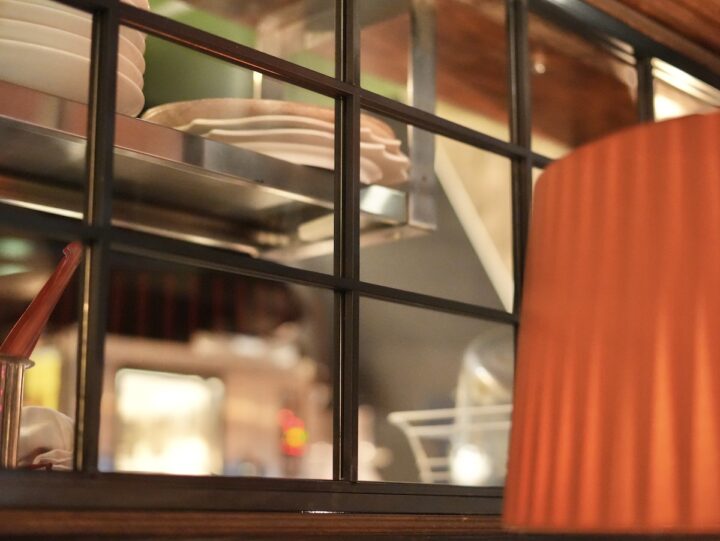 入口付近の壁と厨房の仕切りには、新たにガラスと格子戸風のデザインを採用。余計な装飾を排したことで、シンプルな美しさと落ち着いた雰囲気が際立っています。