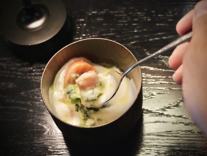 仕上げには山わさびをすりおろしてトッピング。ピリッとした辛味と清々しい香りが全体を引き締め、スプーンで混ぜ合わせるごとに味わいが幾重にも変化していきます。