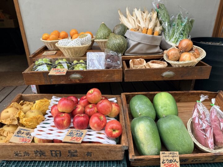 りんごや梨、秋野菜のさつまいもやかぼちゃまで新鮮そのもの。札には各産地も記載され、生産者の想いがそのまま伝わってくるよう。地域の人にとって、ここで野菜を買うこと自体がちょっとした楽しみになりそうですね。