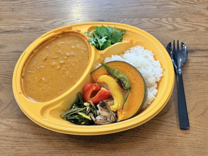 シフク食堂の人気カレー。蓋を開けるとスパイスの香りが立ち上る。ルーはまろやかさとピリッとした辛さが絶妙で、ほろほろチキンと野菜がゴロゴロ。特に野菜の甘みとカレーのスパイス感が絡み合い、贅沢な味わいを演出していました。量もしっかりありながら、胃に重くなくペロリと完食できるちょうどよさ。