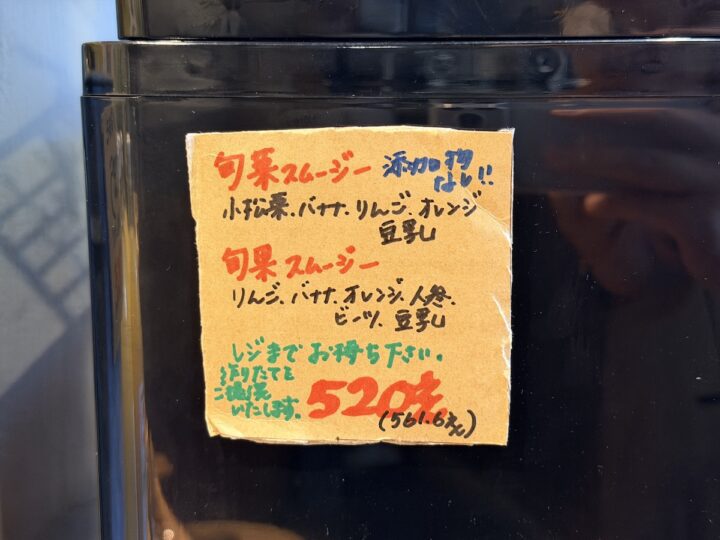 そして作りたてスムージー!!飲んでみたけど、りんごやバナナの自然な甘みに、オレンジの爽やかな酸味、人参とビーツの香りがほんのりと重なり、最後に豆乳が全体をまろやかにまとめてくれる一杯。すっきりとした後味で、”体が喜ぶ”を実感できるフレッシュスムージーでした。