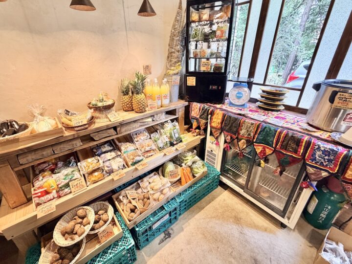 店内に入ると、木の温もりを感じる小さな空間。棚には産直の野菜や果物、手作りのお弁当や惣菜がずらり。大きなお店ではないからこそ、一つひとつが丁寧に手渡されるような温かさがあります。地域の人が買い回れるようにという思いが込められ、「地域の台所」と呼ぶにふさわしい。地域の暮らしに自然と溶け込みます。