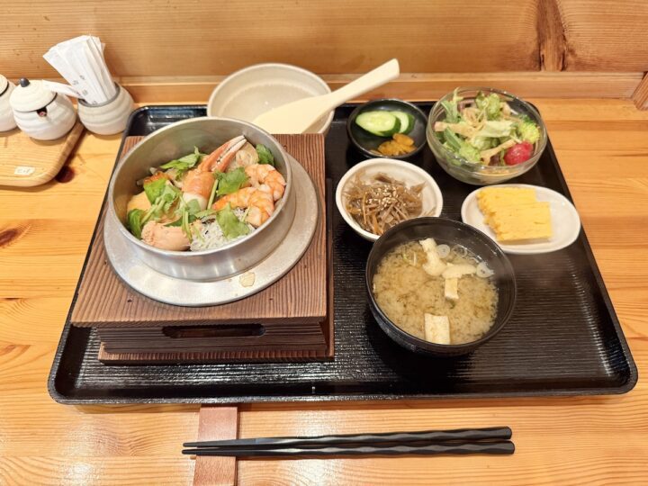 ランチで今回選んだのは「海鮮五目釜めし」(1,800円税込)。小鉢、お新香、味噌汁、サラダまでついてこのお値段。