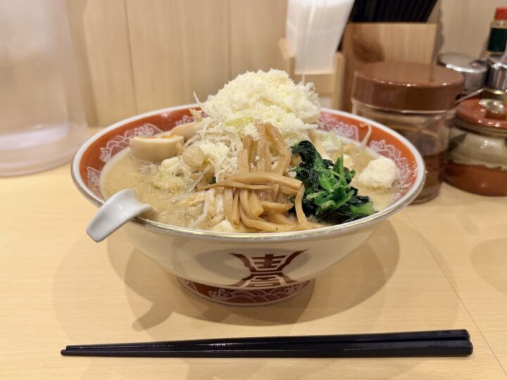 丼を彩るのは、秋の味覚きのこが4種類。キャベツや白菜、もやし、ほうれん草など、野菜もたっぷりでボリューム満点。中央には山盛りの粉チーズがふんわりと積もり、初雪のような見た目。トッピングの半熟味玉はお月様のように輝き、見た目からも秋らしさを演出します。