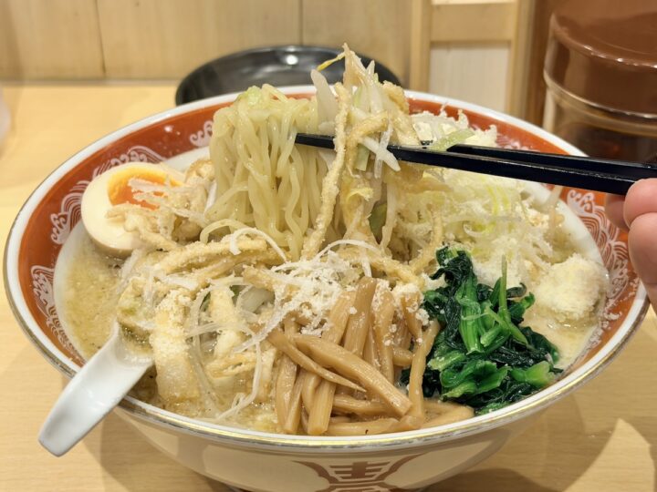 さらに特徴的なのが、パリパリに揚げた細切り餃子皮。スープを吸うと程よくしんなりし、香ばしさと食感の変化が楽しめる。麺を持ち上げれば、チーズとスープがとろりと絡み、まさに“チーズ月見”の名にふさわしい濃厚な味わい。具沢山で贅沢な秋の限定ラーメンです!!