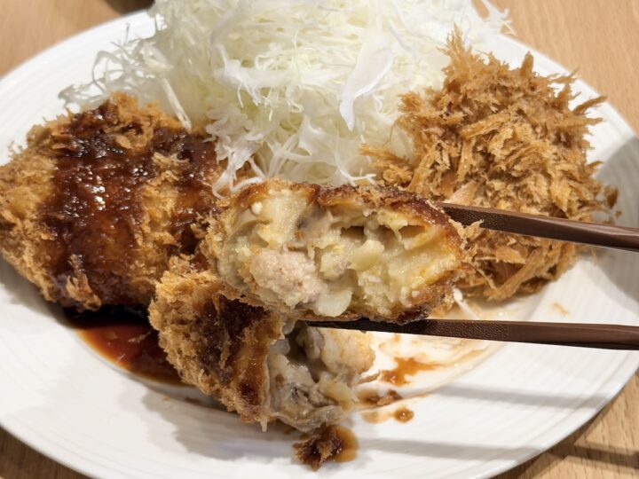 衣は香ばしく薄づきで、油っこさを感じない上品な仕上がり。中から現れるのは、ほっくりなめらかなじゃがいもに、卵・豚ひき肉・マッシュルーム・玉ねぎがしっかり混ざり合った濃厚な旨み。