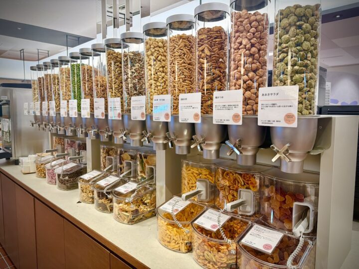 - スナック: 定番のナッツやプレッツェル、柿の種はもちろん、ドライフルーツに駄菓子、さらには小腹満たしに嬉しいパンやインスタントスープまでズラリ。
