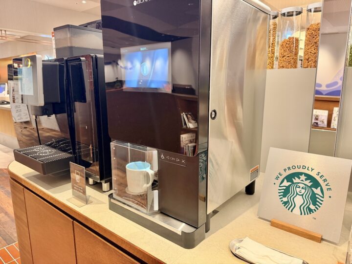 やっぱりこれは真っ先に目に飛び込んでくる。店内に設置されたコーヒーマシン、なんとスターバックスのコーヒー体験を提供するための特別なマシンなんです。ボタンをポチッとするだけで、あの店の味が抽出されます。
