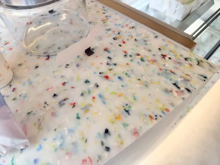 まず目に入るのはカウンターの天板。実はペットボトルのキャップを粉砕して樹脂で固めた「REMARE社」製のボード。本来なら焼却処分され、大量のCO2を出してしまうはずだった複合プラスチックが、こんなに美しいマテリアルに生まれ変わるとは。カラフルな粒子が散りばめられ、ひとつとして同じ模様がない。