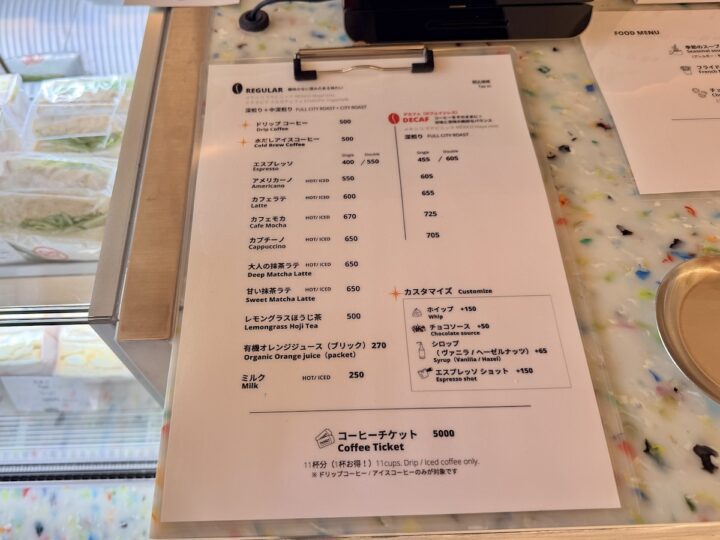 カフェインレス(デカフェ)メニューや、カフェラテ、カフェモカ、大人の抹茶ラテなど、ドリンクメニューも豊富なので、コーヒーが苦手な方やお子様連れでも安心です。