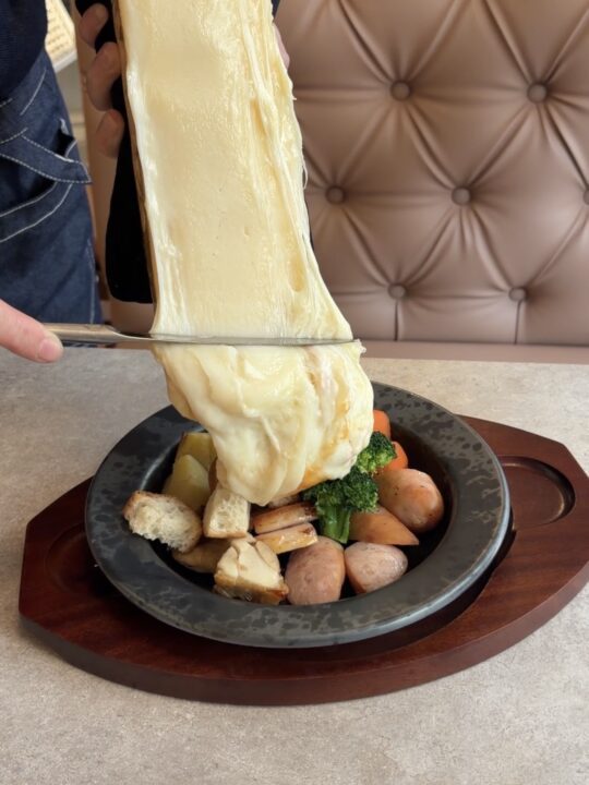 チーズをグツグツと温め、ナイフで削ぎ落とすと…
