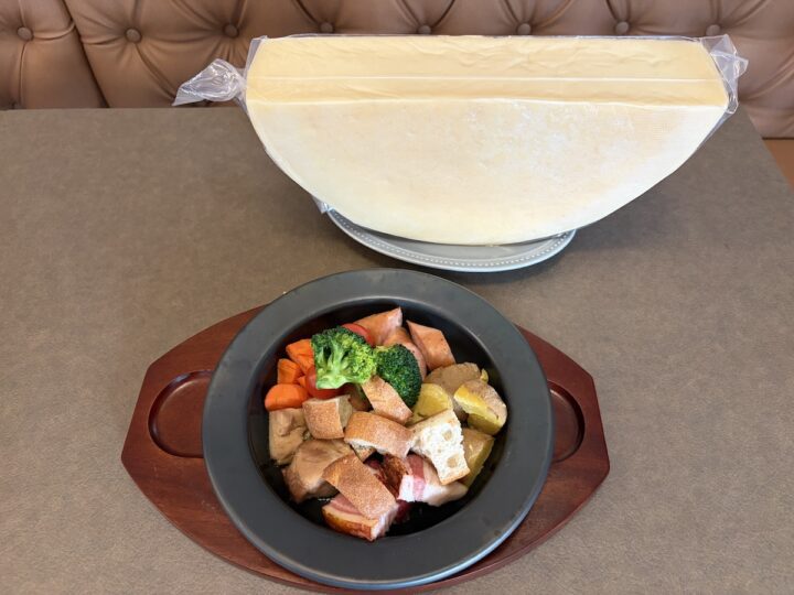 続いてチーズ料理の王様よ。「とろ~り厳選ラクレットチーズ~vege & meat carnival~」(2,880円)。大きな大きな半月型のチーズが登場!
