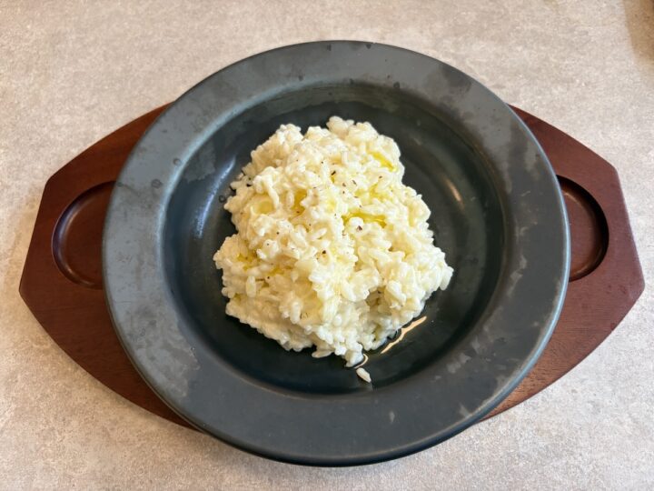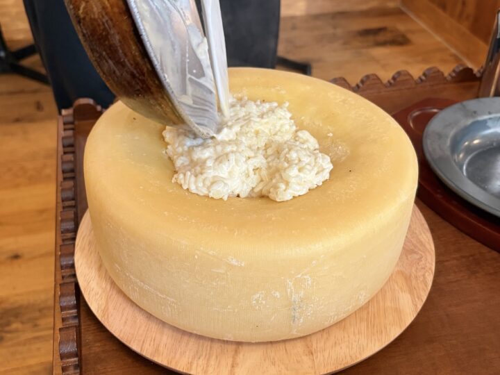 まだまだ終わらない。「その場で仕上げる 濃厚チーズリゾット トリュフの香り」(2,280円)。こちらも目の前で仕上げてくれるライブ感あふれる一品。