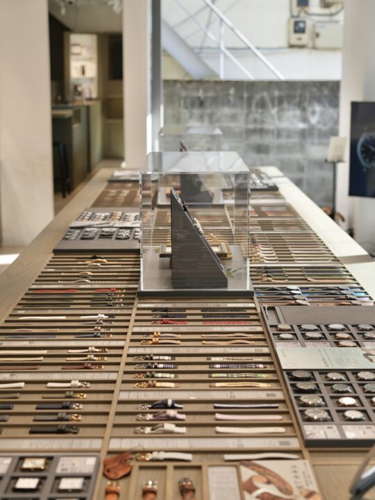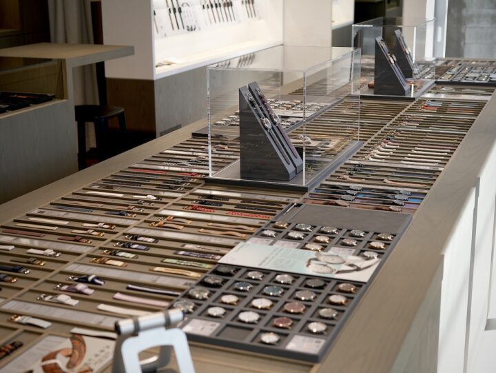 文字盤の異なる時計本体と、革・ナイロン・伝統工芸などを使ったベルトがズラッと整列。テーブルの上には、同じものがふたつとない時計本体とストラップが、美術館の展示のように並んでいて、眺めているだけでうっとりするほど圧巻。