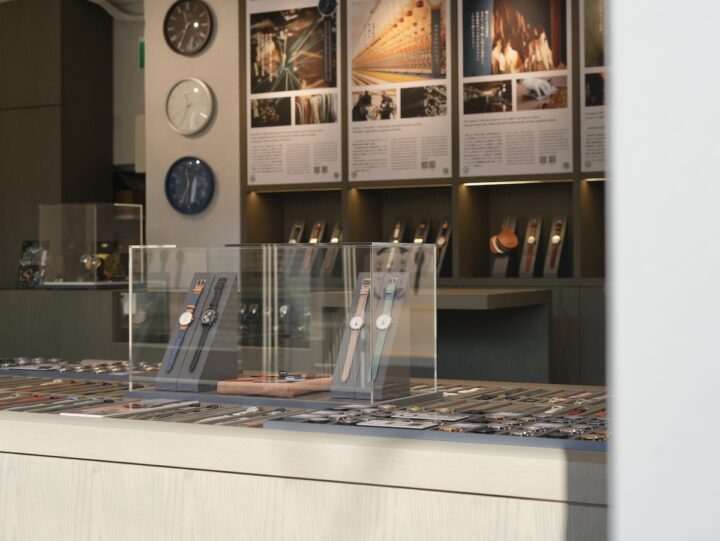 白を基調とした内装に、自然光が差し込む明るい空間。壁面には、日本各地の「MUSUBUパートナー」=職人や工房の紹介パネルも掲出されていて、ただの時計店というより“日本のものづくりギャラリー”といった雰囲気です。
