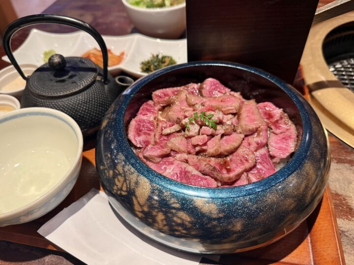 甘ダレをつけて口に入れてみれば、噛んだ瞬間に上質な脂と赤身が絶妙なバランスで広がり、舌の上でトロリととろける感覚。一方の石焼ビビンバも負けじと存在感を放つ!!!器はしっかりと熱された石鍋。ビビンバの上には卵黄がのっていて、火を通すほどに卵黄がとろっと溶け、全体を混ぜ合わせればコチュジャンのピリ辛風味がご飯や野菜に絡み合って、そのまま頬張ると「熱っ!うまっ!」と思わず声が漏れる熱々の味わいです。