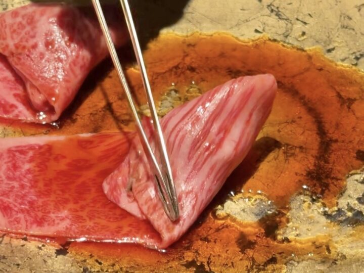 大きなお皿にドーンと鎮座するのは、サシが見事に入った大判の希少部位「ザブトン」。もはや芸術品レベルの美しさ。