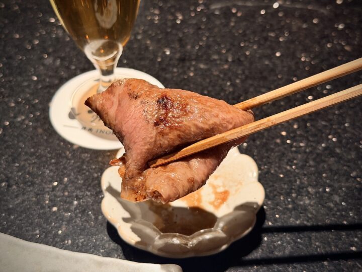 お次は「INOUE希少部位3点盛り」(各2枚 3800円)。この日のラインナップは、カイノミ、ランプ、カタサンカクの3種。