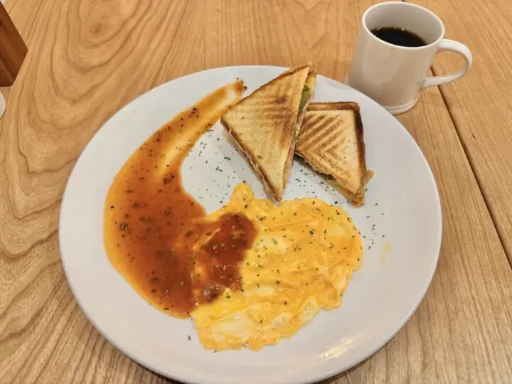 注目の「モーニングセット」は800円で好きなドリンク付き(コーヒーの場合は3種類から選択可)。プレートには、薄焼きのふわっとしたオムレツと、あの「飲めるスパイシーあん」、そして焼きたてのホットサンドが鎮座。