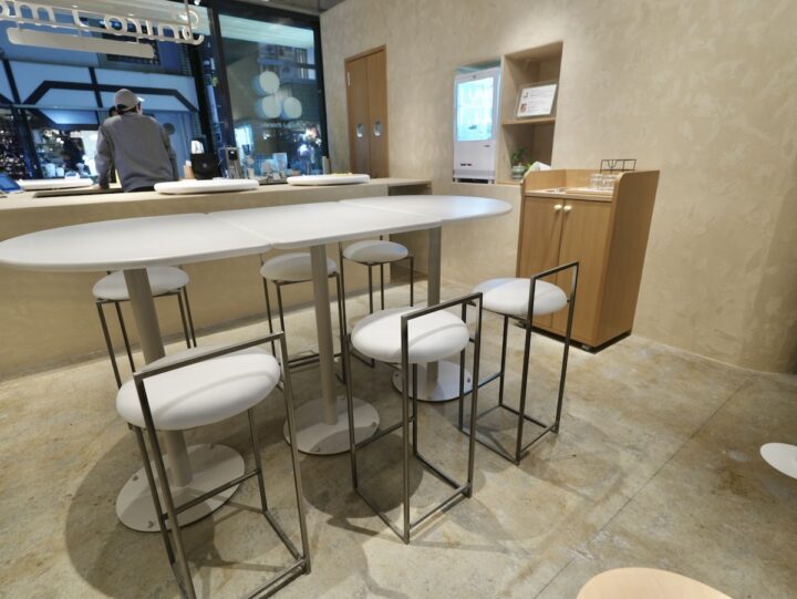 お店に到着してまず驚くのが、洗練された佇まい。 外観は、まるでミルクのピュアさを象徴するかのような、一点の曇りもない「白」を基調としたデザイン。