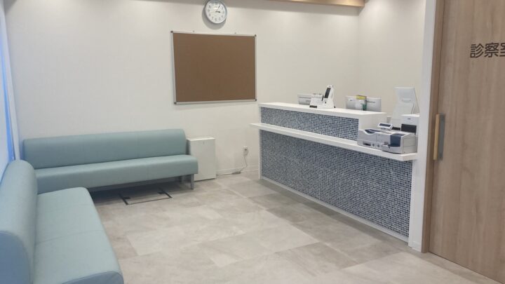 院内に一歩足を踏み入れると、白と淡いブルーを基調とした清潔感あふれる空間。受付カウンターのモザイクタイルがお洒落。待合室にはゆったりとしたペールブルーのソファが並び、リラックスして診察を待つことができます。