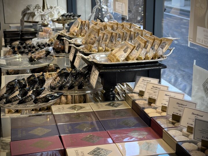 重厚な什器に飾られた焼き菓子や、上品なロゴ入りのギフトボックスが整然と並ぶ空間。自分へのご褒美や大切な人へのギフトを選ぶ特別なひとときを演出してくれます。