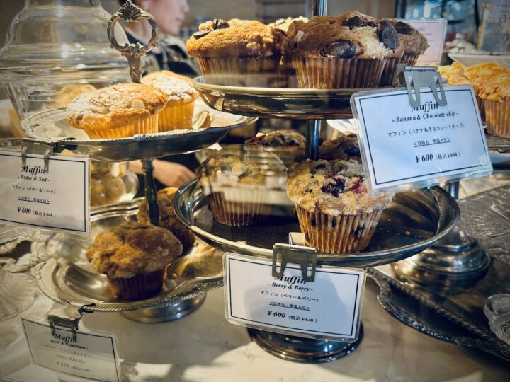 1階のショーケースには、パウンドケーキ、マフィン、ブラウニー、クッキーなどがずらりと並びます。