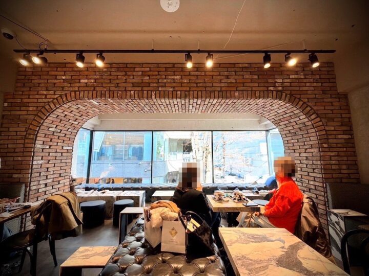 今回は2階のイートインスペースを利用しましたが、レンガ造りの大きなアーチが印象的な壁面、大理石調の重厚なテーブル、そして深い色合いのレザーソファ。
