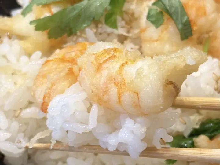 揚げたての海老のかき揚げをバラして、ご飯の上にのせた贅沢な一品。
