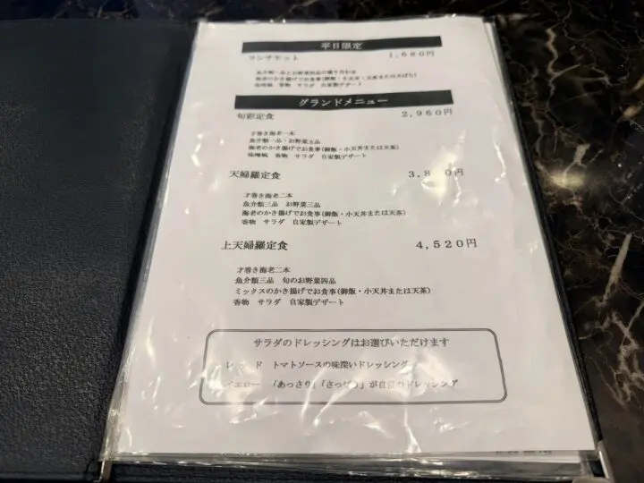 そしてお食事のチョイス。今回は「天ばら」を選びました。