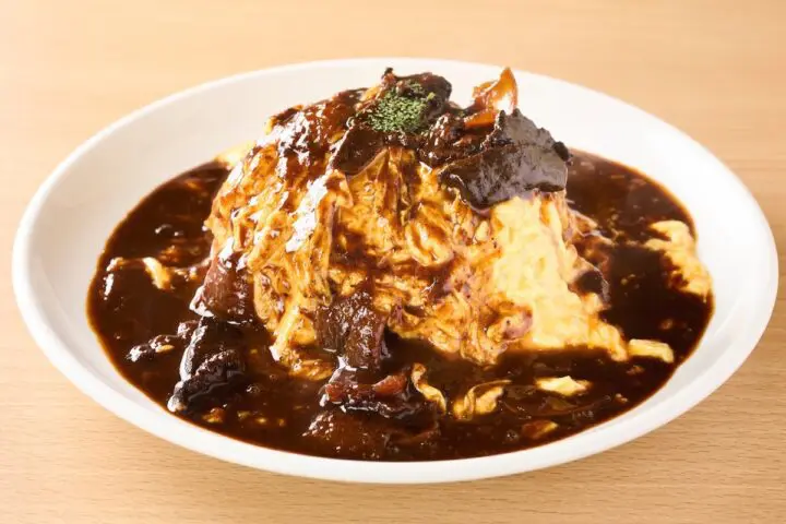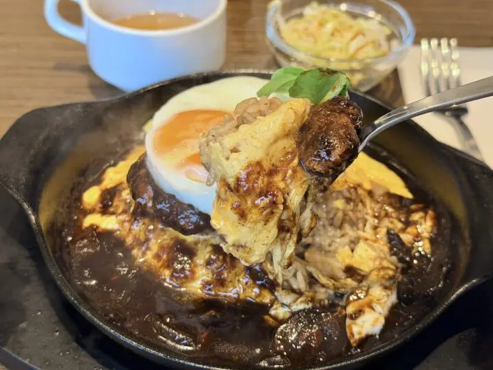 土台のガーリックライスは、一粒一粒が立っており、ガーリックがよいアクセント。そしてたまごの“ふわとろ”感と見事に調和。デミグラスソースは深く、甘みとコクのバランスが絶妙で、ハンバーグの肉肉しさを一層引き立ててくれます。