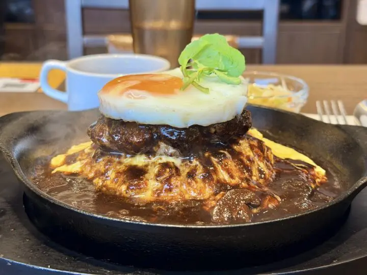 そしてもうひとつ!王道にして最強のビジュアルを誇る「目玉焼きハンバーグオム(デミグラスソース)」もいただきました!(渋谷店で)