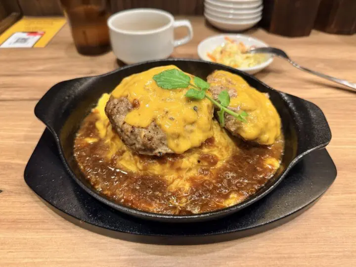 熱々の鉄板の上には、黄金色に輝くふわとろのたまご。その上に、140gの大きなハンバーグが2個、ドーンと鎮座。さらにその上を覆い尽くすのは、とろ〜りと溶けたチーズ。仕上げにたっぷりと注がれた濃厚なステーキソースが、鉄板の上で「ジュゥゥゥッ!」と音を立てながら香りを弾けさせています。
