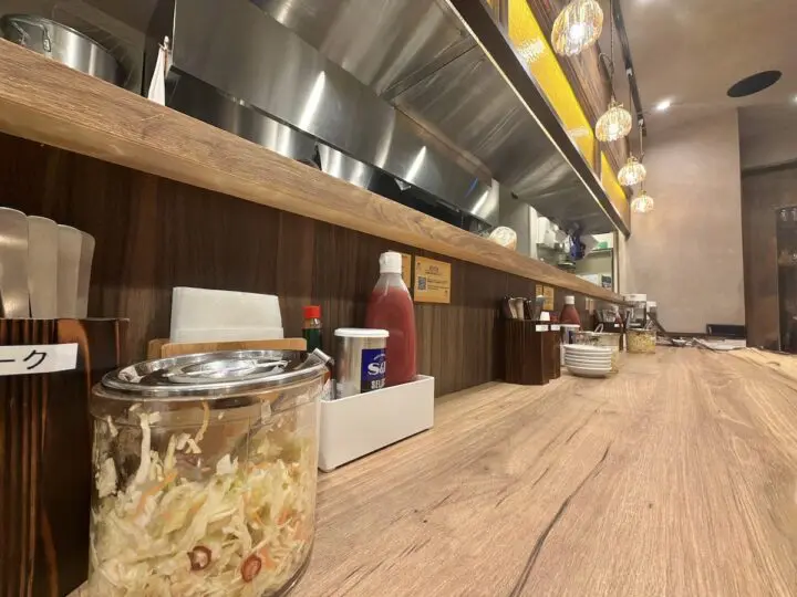 外の食券機で食券を購入してから店内へ。扉を開けると、そこには「木目」を基調とした、清潔感ある空間が広がっています。店内は全12席で、カウンターが6席、テーブルが6席と、コンパクトながらも居心地が良い設計。