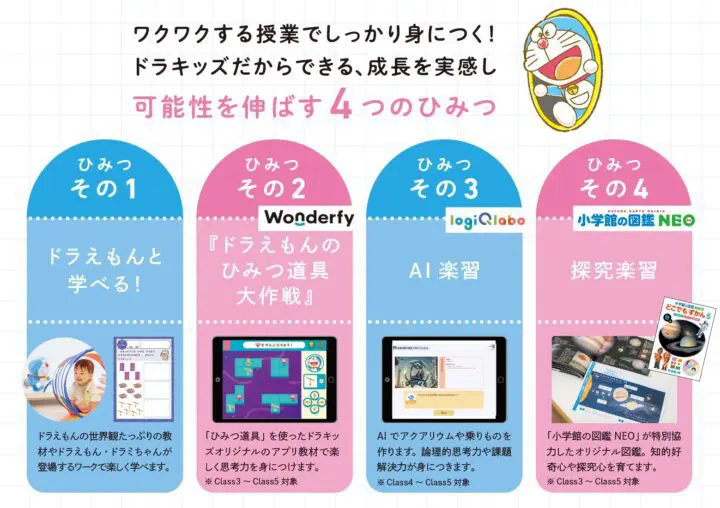小学館の幼児教室ドラキッズは、0歳10ヵ月から小学3年生までのキッズを対象に、脳育プログラム、小学館の図鑑NEOとのコラボレーション教材やドラえもんのひみつ道具が登場する思考力アプリ、AI楽習など独自の教育プログラムを提供。