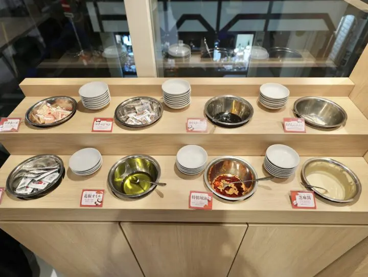 料理が届いたら、調味台へ。マヨネーズ、コチュジャン、オイスターソース、おろしにんにく、花椒オイル、特製辣油、芝麻醤(チーマージャン)、ケチャップの8種類が自由に使えます。