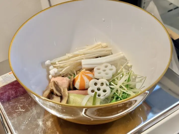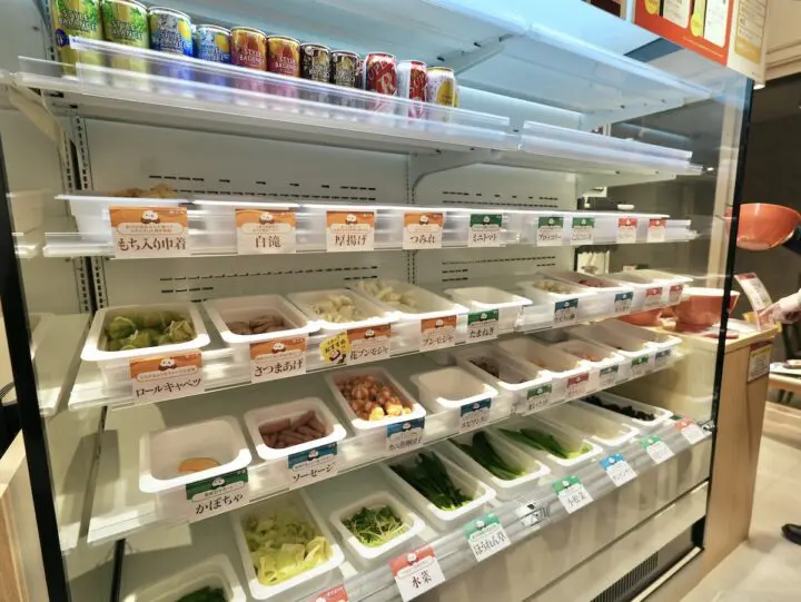 店内の食材ショーケースには、野菜・きのこ・豆腐・肉・海鮮など40種類以上の具材がずらりと並びます。好きな具材をボウルに盛り付けて、レジへ。